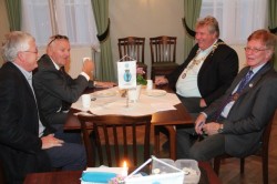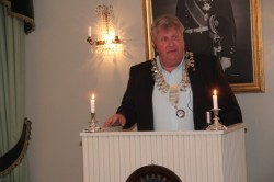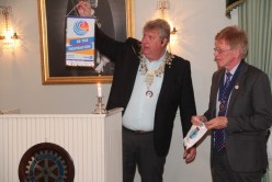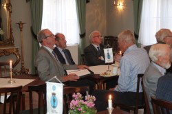 Det ble noen spørsmål/kommentarer etter foredraget. DG hadde med en flaske vin, som han ønsket å gi til et medlem som alltid sier JA og alltid har kaffen klar. Flasken ble da gitt til Erling Aabakken – under stor applaus. Så byttet guvernør og vår president vimpler.