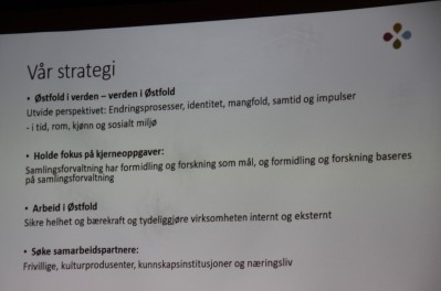 Avd.dir. Lillian Nyborg fikk ordet og fortalte om utviklingen av museet i Halden, - Halden historiske Samlinger (HhS) – og alt dermed tilhørende. Organisasjonen har pr i dag 8 fast ansatte (viste fotomontasje). Vi jobber etter ”Framtidas museum”, Stortingsmelding 49 som kom for 10 år siden. Den gir i hovedsak museene 4 arbeidsområder: 1) Nå flere befolknings- og aldersgrupper. 2) Øke innsikt og kritisk refleksjon, 3) Bidra til by- og tettstedsutvikling og 4) Forvaltning av og tilgjengeliggjøring av samlinger. Innenfor disse områdene er det viktig at det drives forskning. Det har tidligere vært drevet en del forskning i museene, men det har vært mer tilfeldig, - om man har hatt tid og interesse. Nå er dette pålagt som en viktig del av arbeidet.