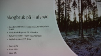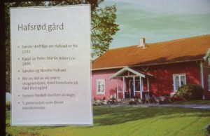 Foredragsholderen fortalte om ulike aktiviteter på eiendommen: Skogbruk, gårdsbruk, reiseliv og andre muligheter. Viste kart over eiendommen. Det første man har hørt om Hafsrød Gård er fra 1593, kjøpt av Petter Martin Anker i 1890. Det var da 2 eiendommer som ble slått sammen. Anker bodde selv på Rød Herregård, aldri på Hafsrød. Gården er først blitt bebodd av senere generasjoner.