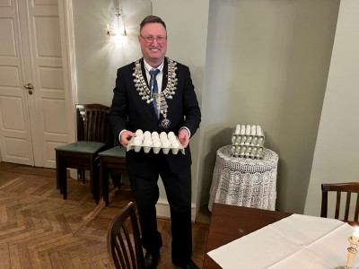 6 medlemmer kunne reise hjem etter utlodning med hvert sitt brett med egg. Presidenten takket guvernøren med følge for besøket, takket medlemmene for fremmøte, slukket lysene og ønsket alle vel hjem.