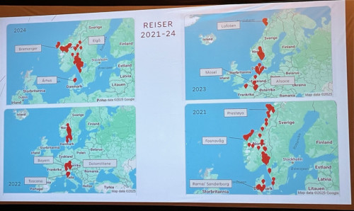 Vi fikk se bilder fra reiser til Toscana, Venezia og Pisa. Fra Tyskland hørte vi fra Moseldalen og Alsace (Frankrike) med deres gode viner og fra Hamburg med sin gedigne modelljernbane.