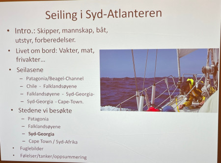 Vi fikk også høre om de rigide toll- og immigrasjonsmyndighetene på de forskjellige stedene de besøkte. Svein viste oss flotte bilder og filmsnutter fra Falklandsøyene, og ikke minst fra Grytviken på Sør-Georgia. Her fikk vi se et rikt dyreliv og etterlatenskaper fra norsk hvalfangst, som var stor i området i sin tid.