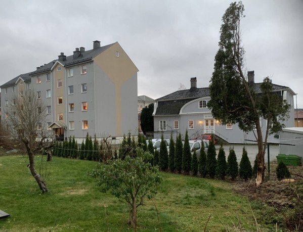 Bildet fra 2020 viser det som er bevart av den tidligere kjøpmannsgården som også overlevde bybranner på 1800-tallet. Østlig boligblokk sees på bildet fra baksiden.