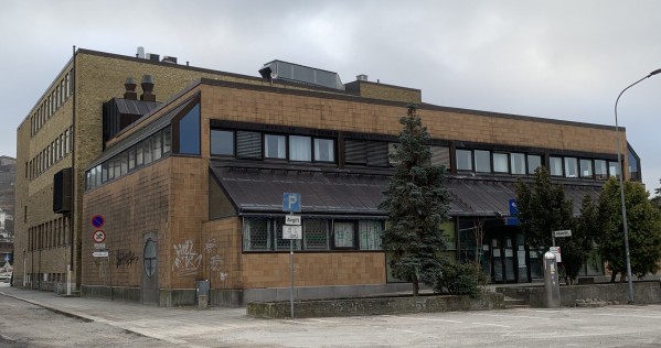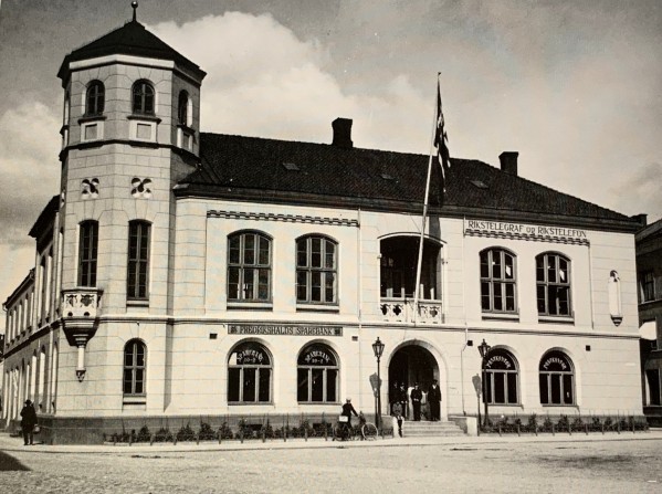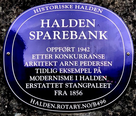 Halden Sparebank: Erected 1942 after competition. Architect Arne Pedersen. Early example of modernism in Halden. Replaced Stangpaleet from 1856.