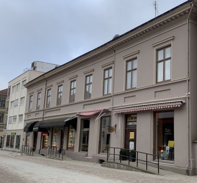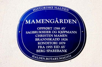 The Mamen Building: Erected 1788 by sawmill proprietor and merchant Christen Mamen. Damaged by fire 1826. Bakery 1879. Owned by Berg Sparebank since 1955.